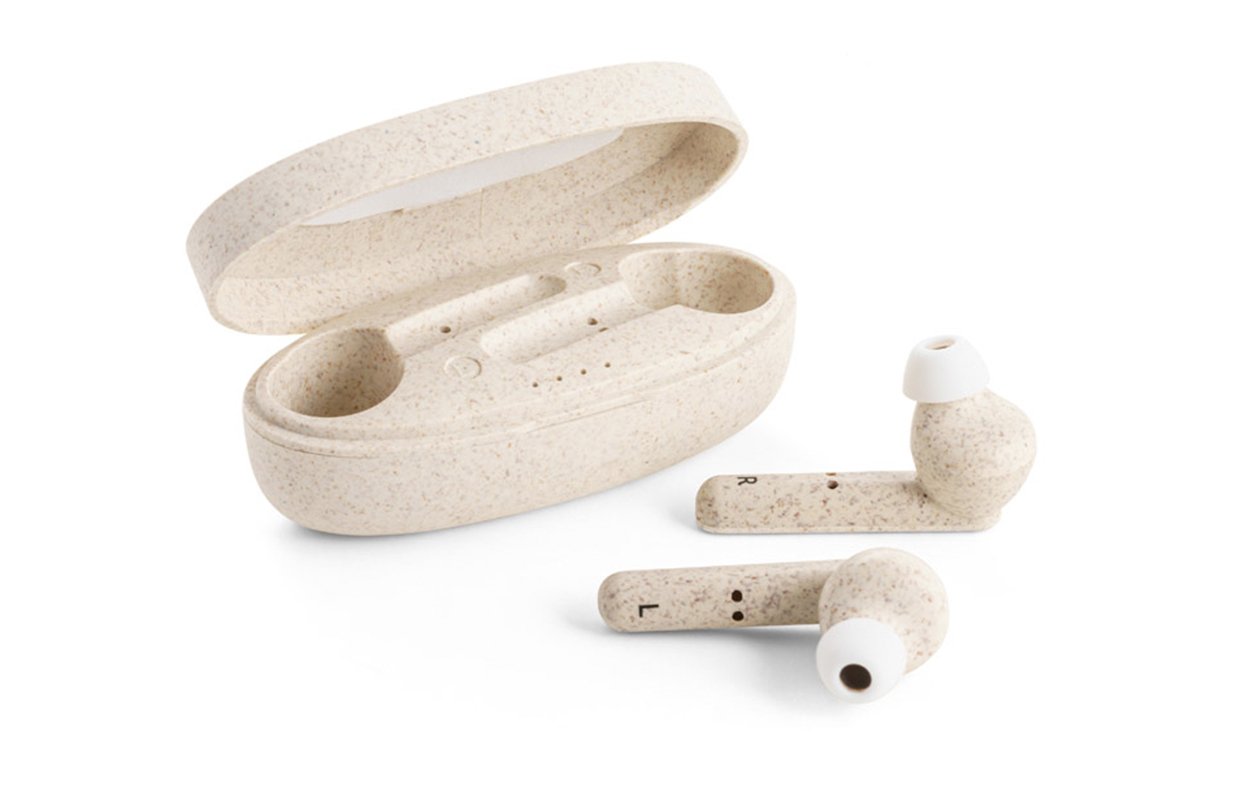 Auriculares inalámbricos hechos a base de fibra de paja de trigo y PP. Cuenta con transmisión Bluetooth 5.0 hasta 10m de distancia y autonomía hasta 3hrs (standby hasta 10 hrs). Cada auricular tiene un botón multifunción y micrófono integrado, lo que facilita la respuesta a las llamadas en modo manos libres y una luz indicadora LED. Tiene una batería de 300 mAh e indicador de carga . Incluye un cable de carga micro USB.