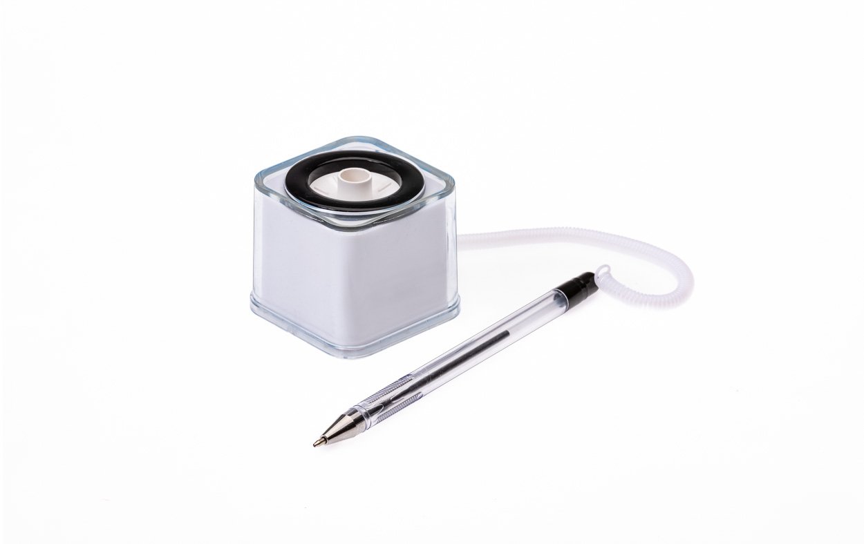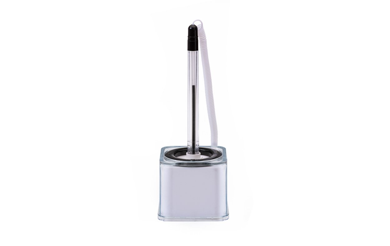 Bolígrafo plástico con base cuadrada con adhesivo, que permite personalizar en sus 4 caras.