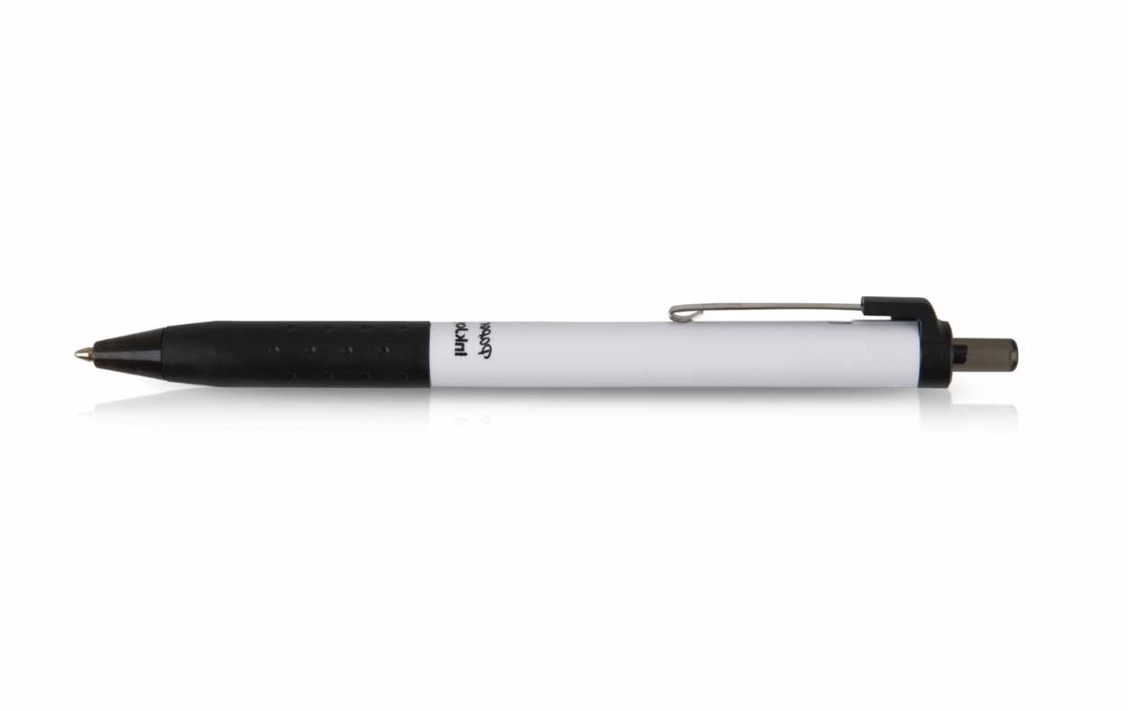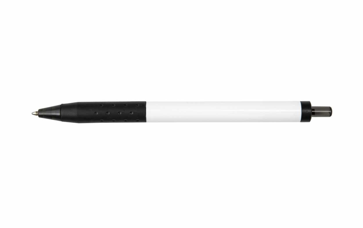 Cuerpo plástico, clip metálico, grip de silicona, tinta negra
