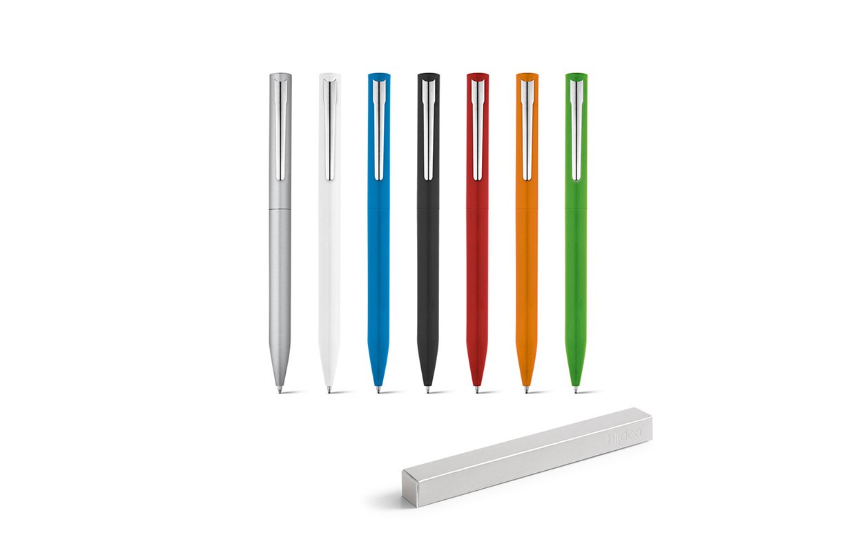 Bolígrafo fabricado en aluminio con mecanismo de giro, clip metálico con acabado cromado brillante. El cuerpo está lacado en acabado brillante. Tinta azul. Carga metálica con Tinta Dokumental® azul. Se suministra en estuche de regalo (desmontado).