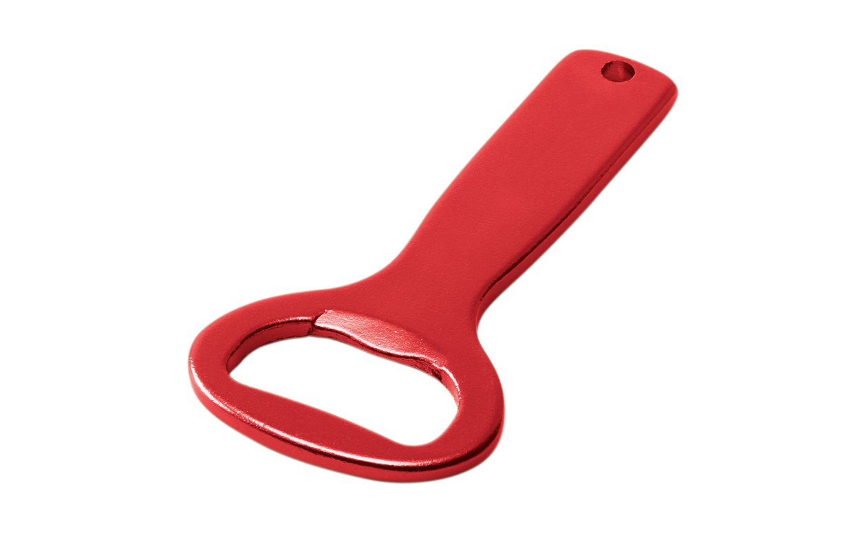 Destapador de aluminio con orificio en la parte superior para poder colgarlo. Medidas:3,9 x 8,3 cm