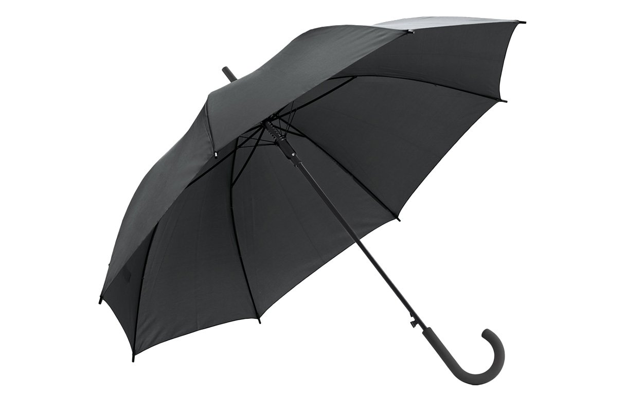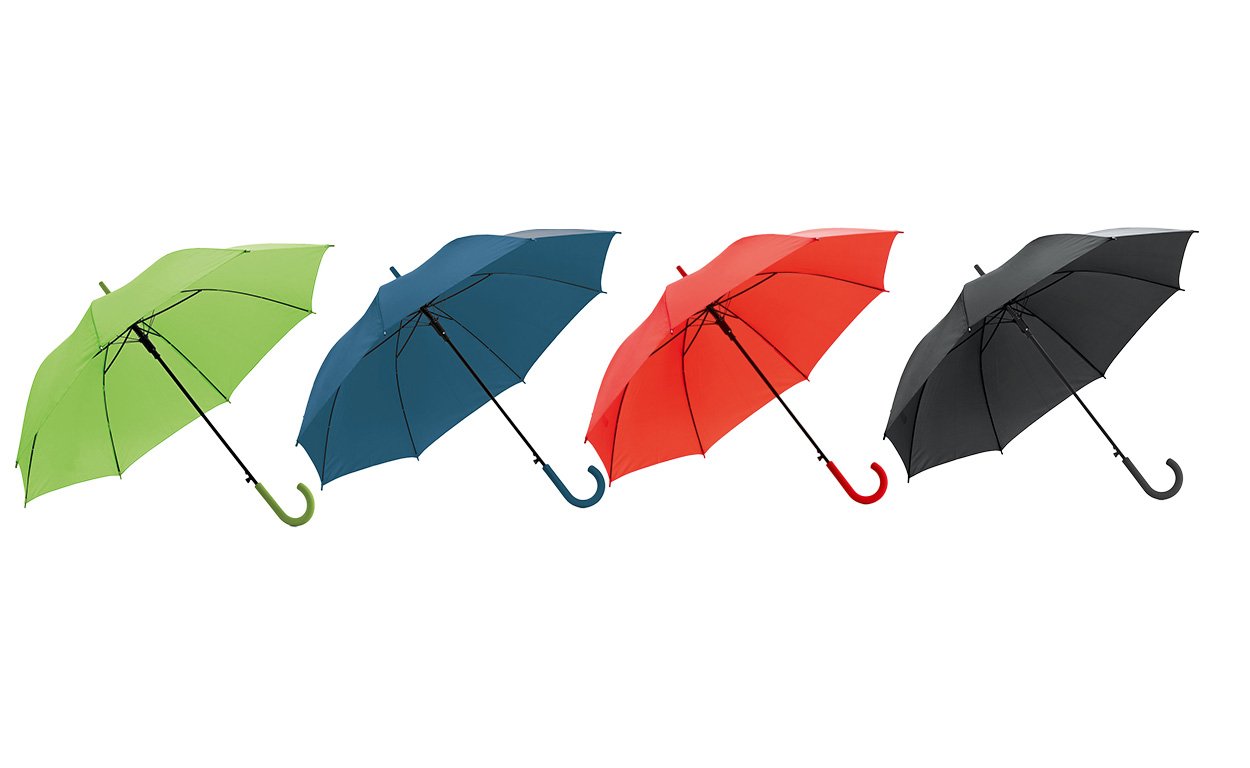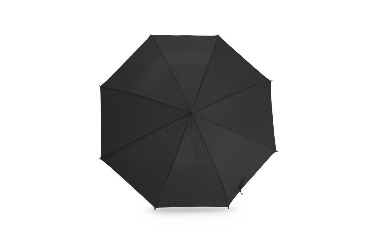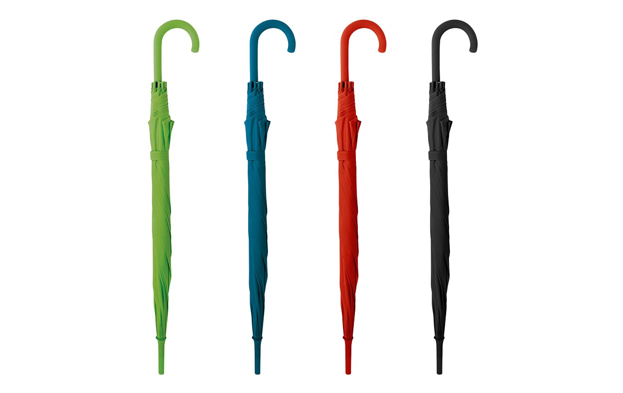 Paraguas de 8 gajos con mango curvo de goma y estructura metálica. Con mecanismo de apertura automática. Material: Poliéster 190T.
