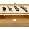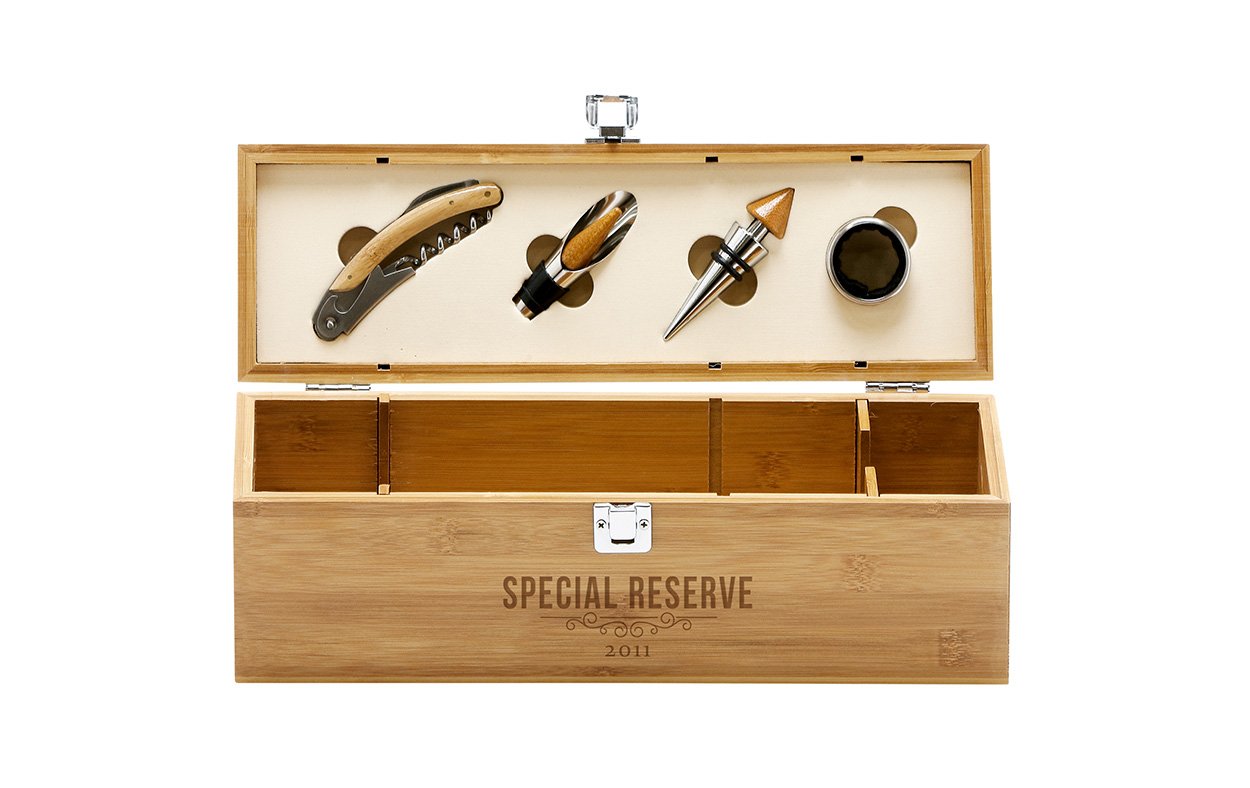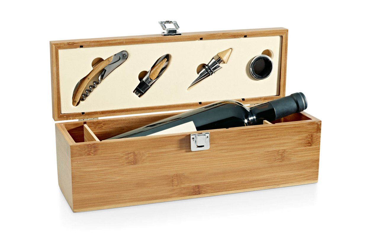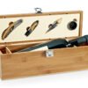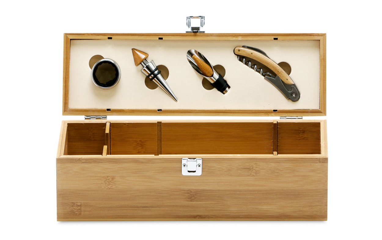 Set de vino que contiene 4 piezas, fabricadas en madera y metal. Incluye sacacorchos con navaja sommelier, gargantilla recoge gotas, un dosificador y tapón. Se suministra en una caja ecológica de regalo de bambú y zinc.
